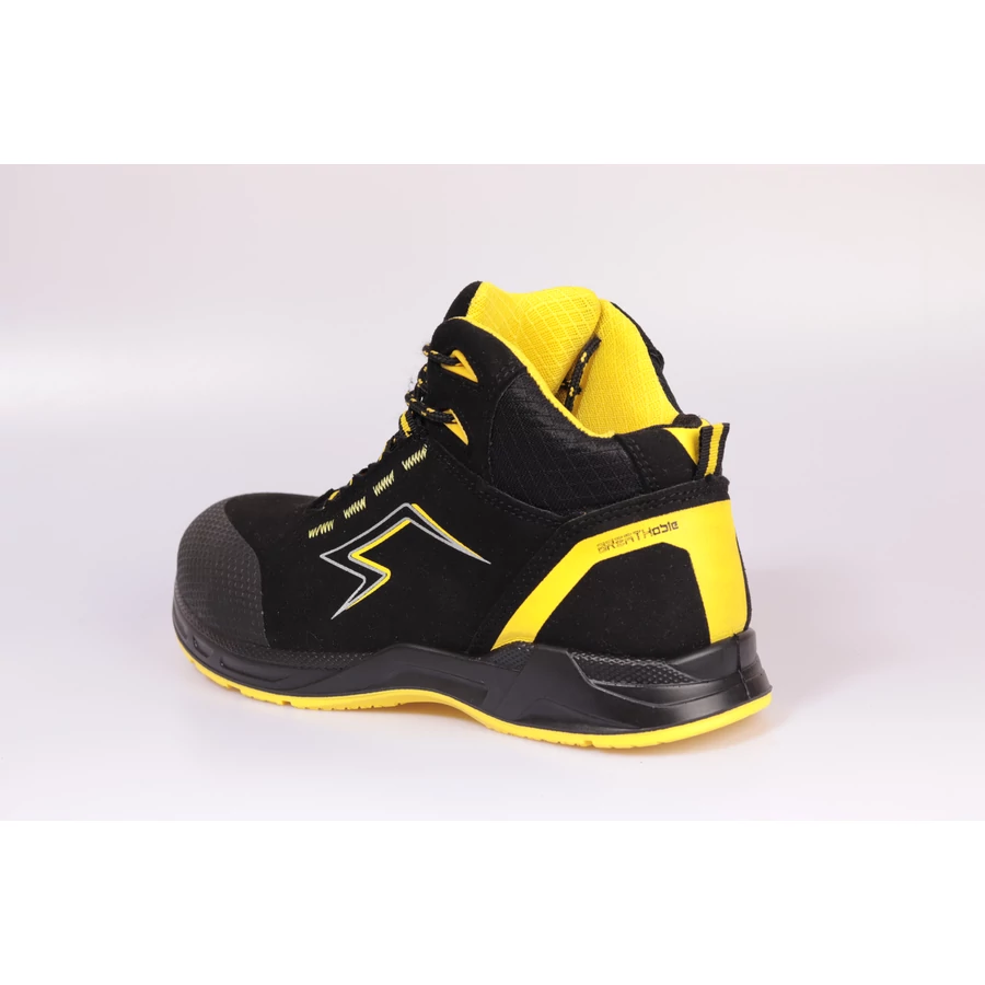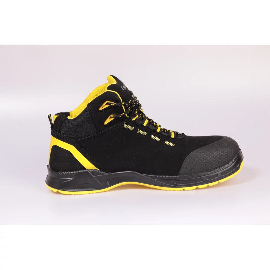 Airflex Breath S3 SRC ESD teljesen fémmentes fekete/sárga munkavédelmi bakancs, légáteresztő vízlepergető mikroszálas, gumírozott felsőrész, fényvisszaverő betétek, légáteresztő Mesh bélés, csúszásmentes, antisztatikus PU-TPU talp, kivehető anatómiai talpbetét, könnyű és rugalmas maxFlex Kevlár talplemez, könnyű kompozit kapli