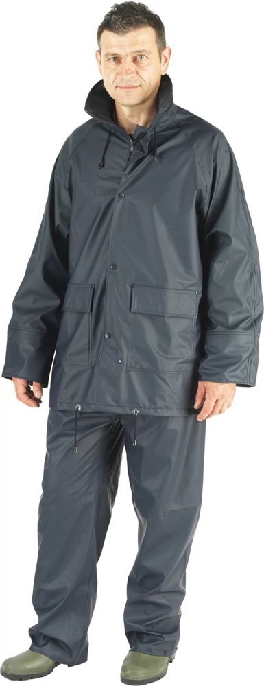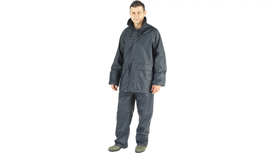 PU KÉK ESŐRUHÁZAT: 170 g/m² poliészterre mártott poliuretán, rendkívül könnyű, nagy szakítószilárdságú, kényelmes viseletű anyag, teljesen vízhatlan, varrott plusz hegesztett illesztések, KÉTRÉSZES RUHA (kabát+deréknadrág): kapucnis, cipzáros+patentos kabát, két zsebbel, gumírozott deréknadrág, szűkíthető bokarésszel, szín: kék, EU szabvány: EN ISO 13688, EN343 | |