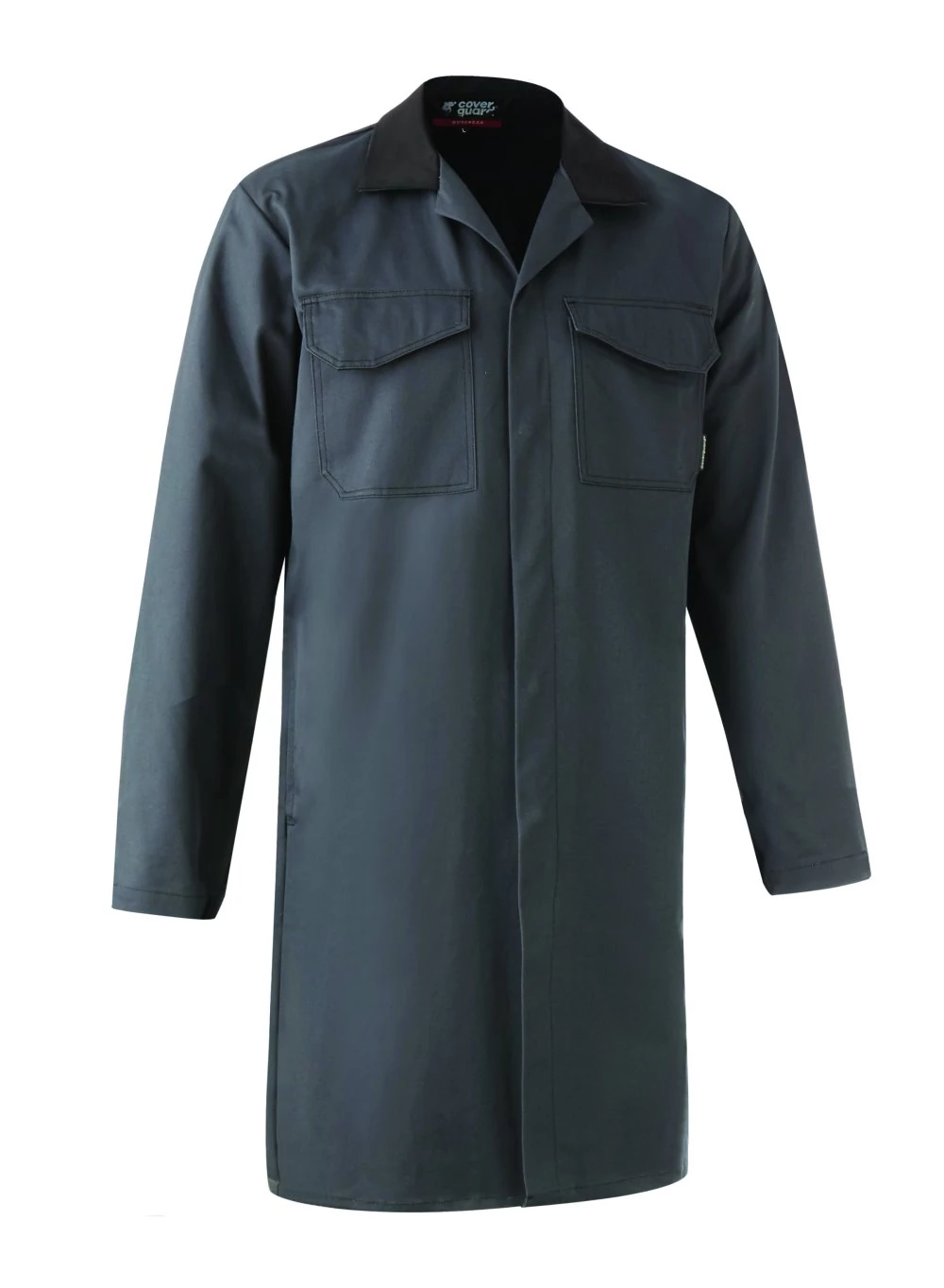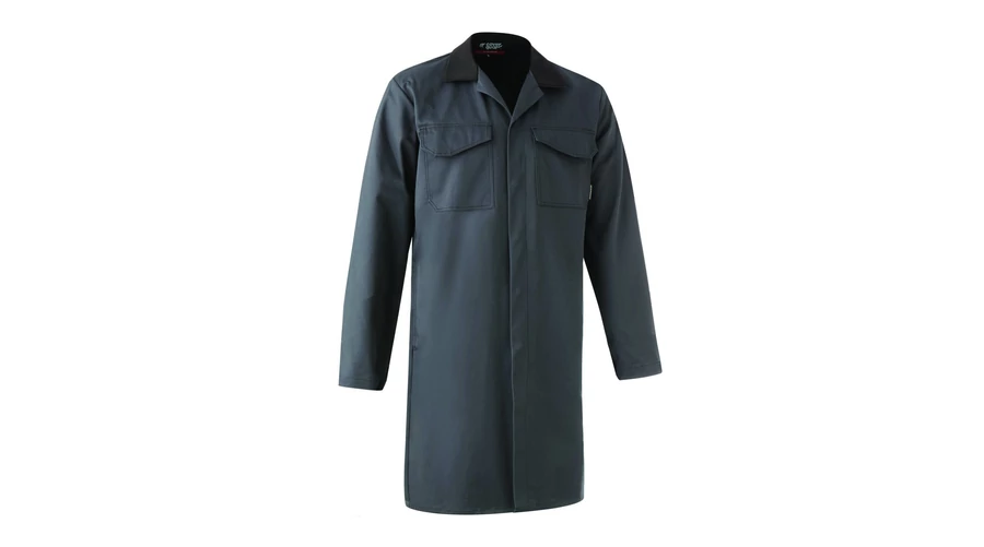 , 300 g/m2 vastag, 60% pamut + 40% poliészter kevertszálas alapanyag, egyenes szabású, kopásálló köpeny, eltérő színű hagyományos gallérral, teljesen fémmentes, ideális intenzív ipari használatra, fedett patenttal záródik, megerősített hátrésszel, hossza (L-es méret esetén): 104,5 cm, patenttal állítható mandzsettával, két fedett felső zseb, két bebújós oldalzseb | |