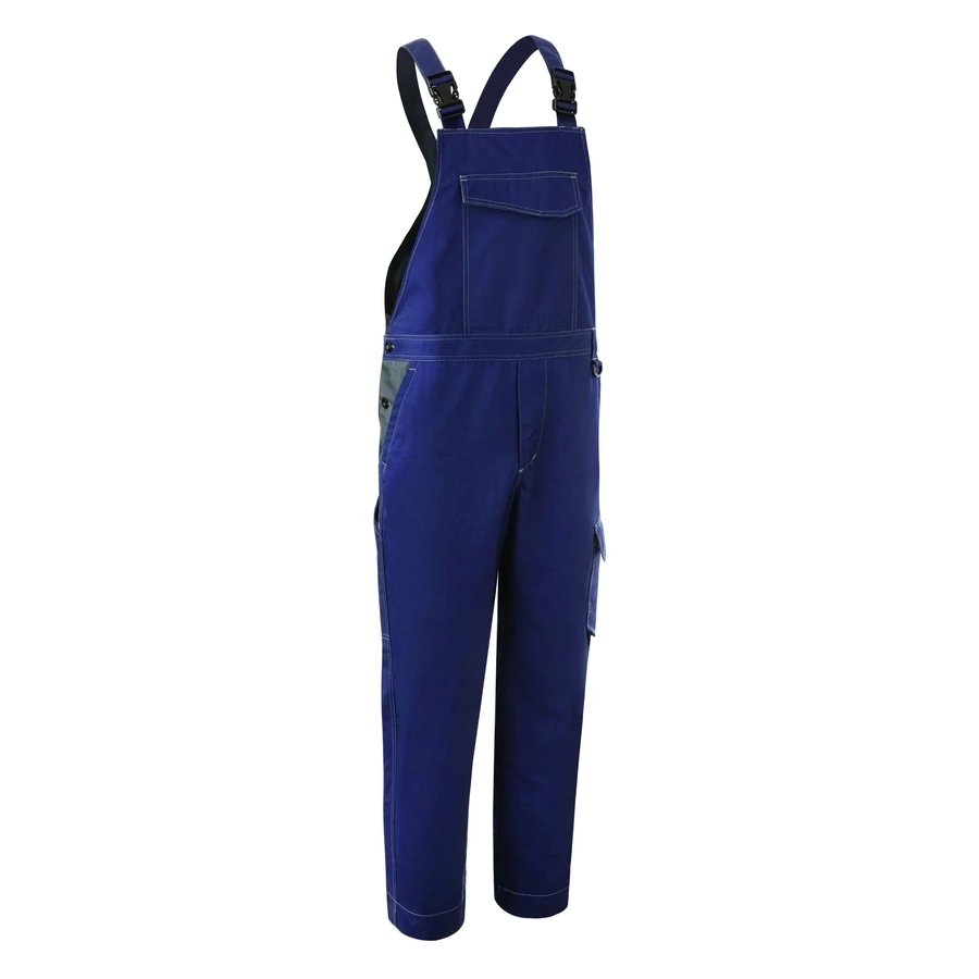 , 300 g/m2 vastag, 60% pamut + 40% poliészter kevertszálas alapanyag, regular szabású, vastag kopásálló mellesnadrág, ideális intenzív ipari használatra, állítható műanyag csatos vállpánt, övbújtatók, kényelmi betét a láb között, gombbal záródó, oldalt gumírozott és oldalgombos derék, megerősített térdrész, a száron még 5 cm-es lehajtási lehetőség, egy tépőzáras mellzseb, két bebújós oldalzseb, két farzseb, egy fedett cargo zseb, egy megerősített vonalzó zseb, műanyag kulcs- vagy kitűző tartó