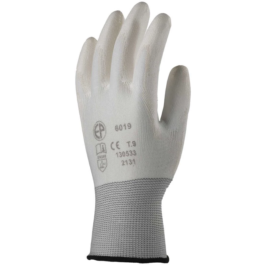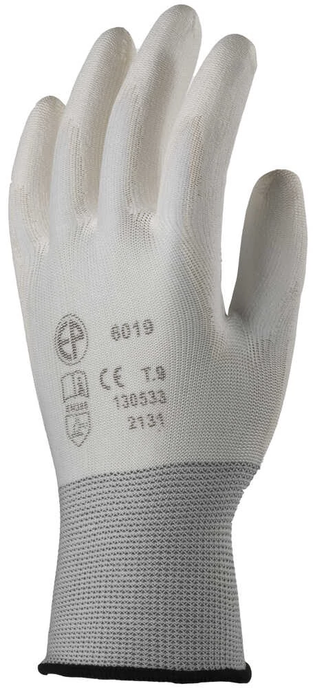 FEHÉR PRECÍZIÓS KESZTYŰ, PU MÁRTOTT TENYÉRREL, kötött, rugalmas, nagy szakítószilárdságú 100% poliészter szál, tenyéren poliuretánnal mártott, precíziós kesztyű gumírozott mandzsettával, szellőző kézháttal, finom, 13-as kötés, extra széles mérettartomány, SZÍN: fehér, méret: 6-os, EU szabvány: EN420, EN388: 4131 (min. rendelési egység: 10 pár)