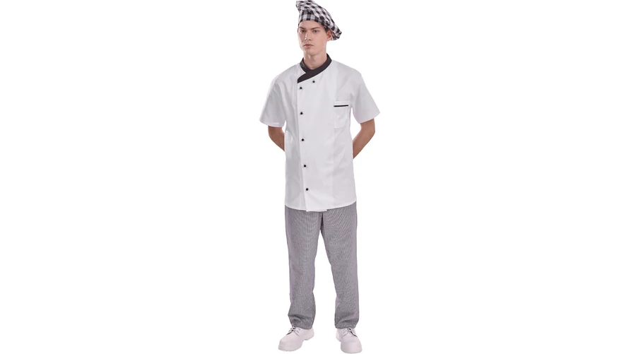SZAKÁCSKABÁT RÖVID UJJÚ, FEKETE GALLÉROS: 245 g/m² vastag, lánckötésű, 65% poliészter, 35% pamut alapanyag, klasszikus fazonú, magasan szabott, fehér színű, kétsoros, cserélhető gombolás, visszahajtható mandzsetta, rávarrt mellzseb, díszcsíkkal, kiválóan szellőző, mérettartó modell, álló gallér, uniszex, átgombolható kivitel, rövid ujjú, fekete galléros kivitel, méret: XS, EU szabvány: EN340 | |