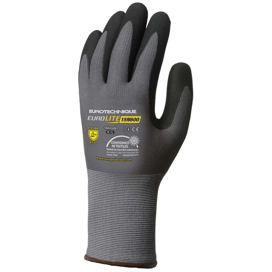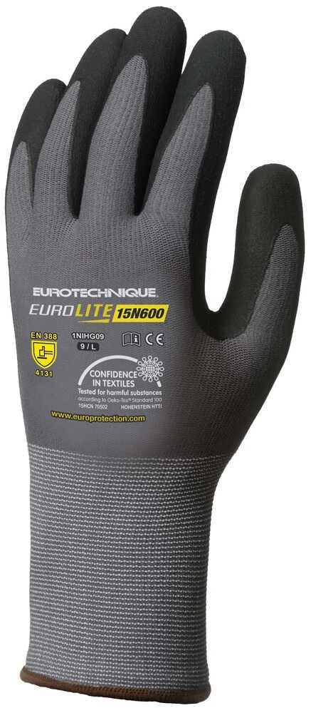 EUROLITE 15N600 FEKETE NITRIL MÁRTOTT KESZTYŰ, 15-ös kötésű, erős szakítás- és kopásállóságú szürke nylon / spandex, tenyerén fekete szellőző mikrohabosított nitrillel mártott, szellőző kézhát, gumírozott mandzsetta, könnyű, kiemelten komfortos, teljesen kézre simuló formai kialakítás, tenyerén és a kézháton is biztosított szellőzéssel, Öko-Tex minősítés, széles méretszortiment, méret: 8-as, EU szabvány: EN420, EN388:2003 4131