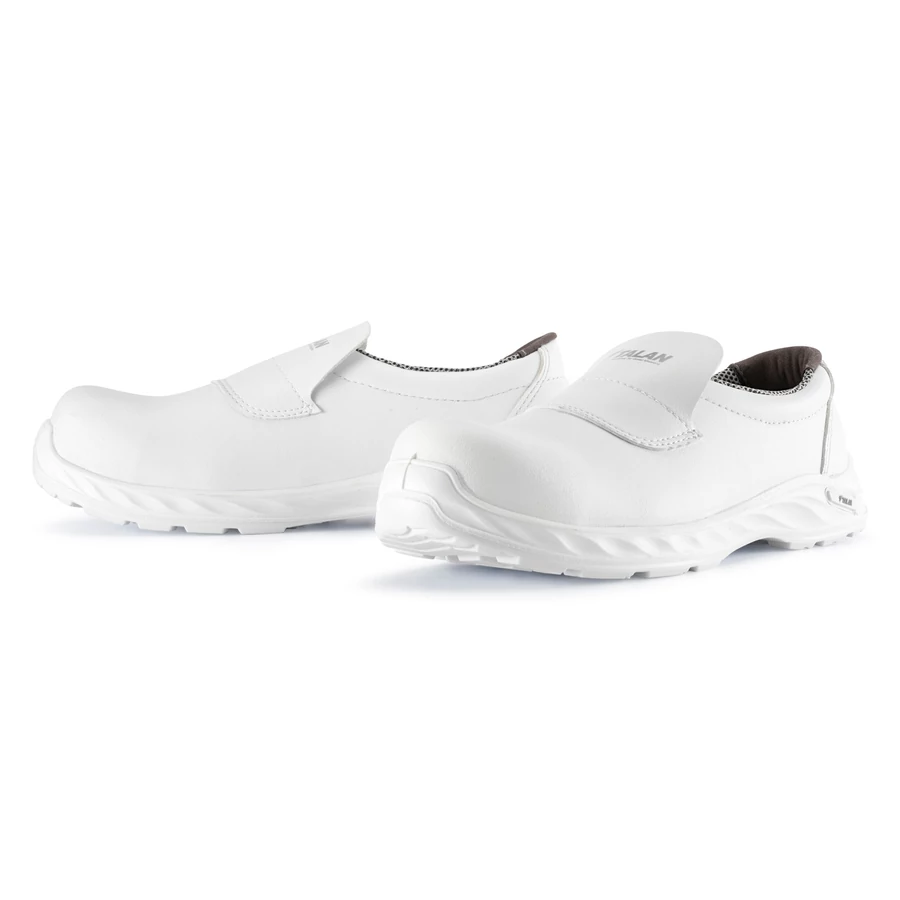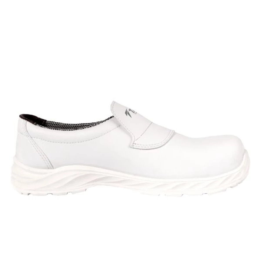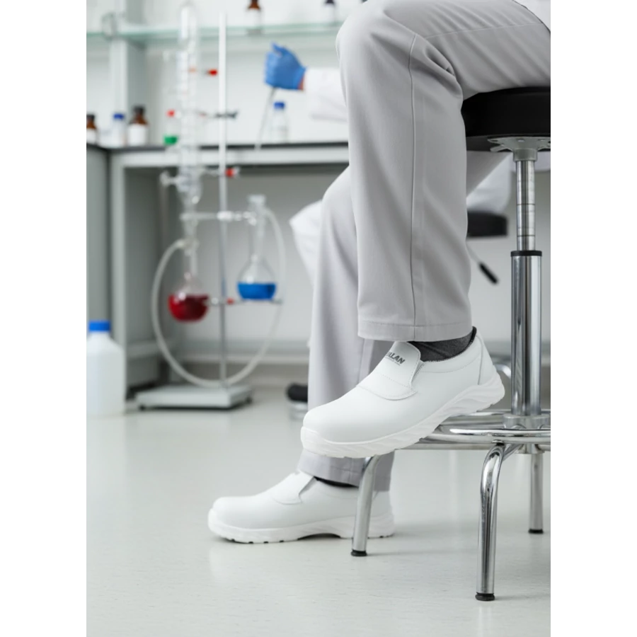 MOON ORION (S2+SRC) extrakönnyű, fehér, vízlepergető mikroszálas bebújós munkavédelmi cipő, légzésaktív szellőző béléssel, olaj- és kopásálló, csúszásmentes kétrétegű antisztatikus PU/PU talppal és kompozit kaplival. Energiaelnyelő sarokrész és lélegző bélés biztosítja a hosszú távú komfortot. Könnyű, mégis megbízható védelem például az élelmiszeriparban vagy egészségügyben dolgozóknak, akiknek fontos a higiénia és a kényelem.