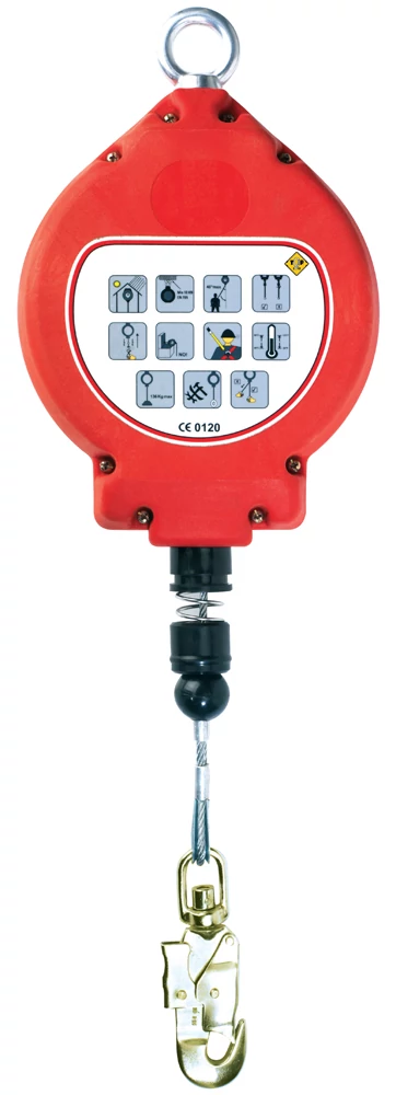 TOPLOCK-C20 71482 VISSZAHÚZHATÓ ZUHANÁSGÁTLÓ, a munkavégző mozgásának megfelelően a zuhanásgátló rugós tartódobja automatikusan le- illetve feltekerve a kötélzetet, állandóan feszesen tartja azt, 135 kg maximális terhelés, rövid fékezőtávolság, legfeljebb 6 kN fékezőerő, acél felfüggesztési pont és alsó gyűrű, visszacsapódást gátló műanyag gömb, kötél csavarodását gátló, pörgetőszemes karabiner dupla rugós biztonsági zárral (220 g), az emelkedő es ereszkedő funkcióval bíró karos személyi mentőkészülékkel (ACRW215, EN1496/B) perceken belül felszínre juttatható egy max. 140 kg súlyú mentesre szoruló, 71480: 20 m hossz, acélsodrony alapanyag, Ø 4,5 mm szélesség, fém ház anyag, 7,4 kg súly, EU szabvány: EN360 | |